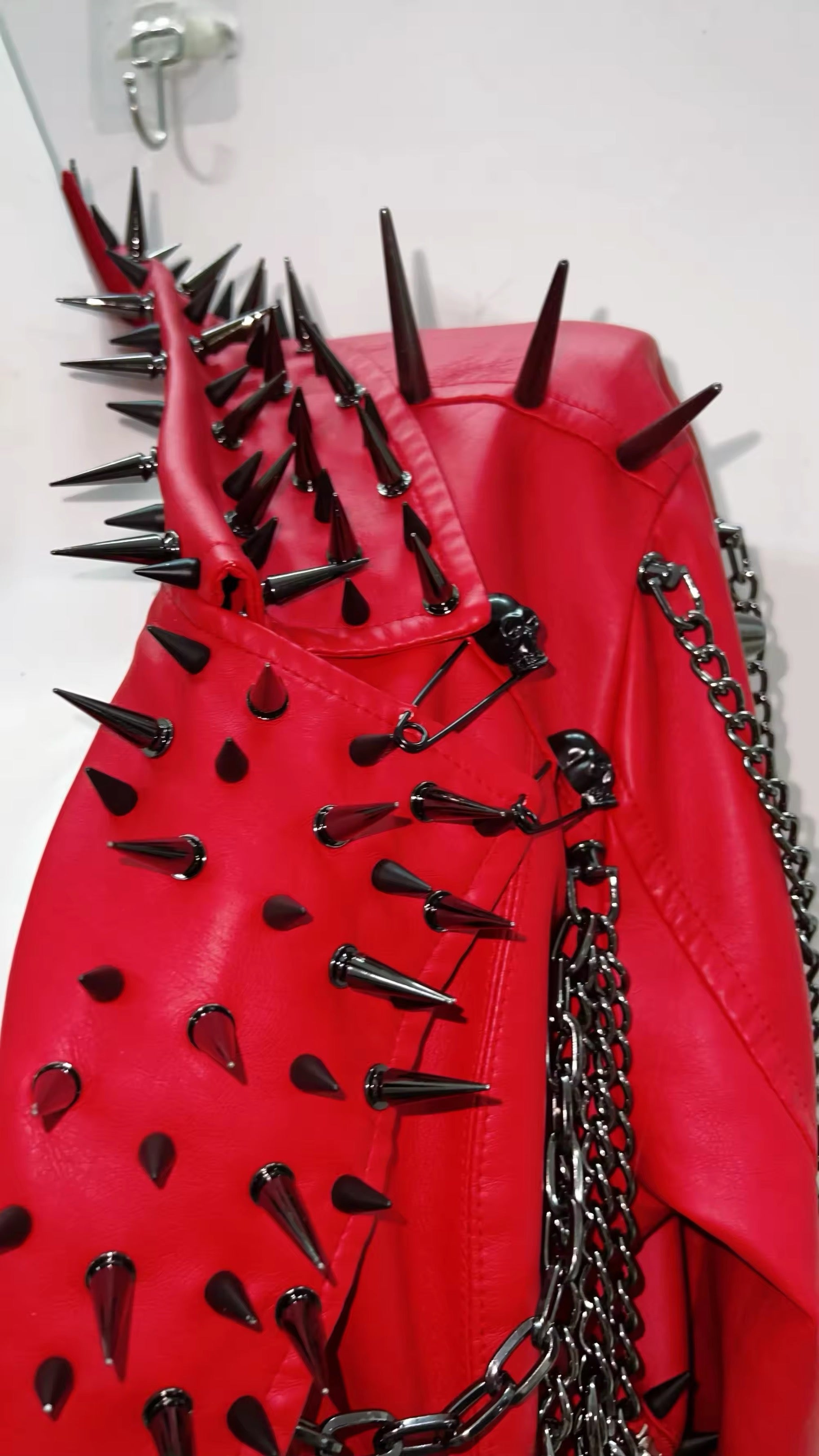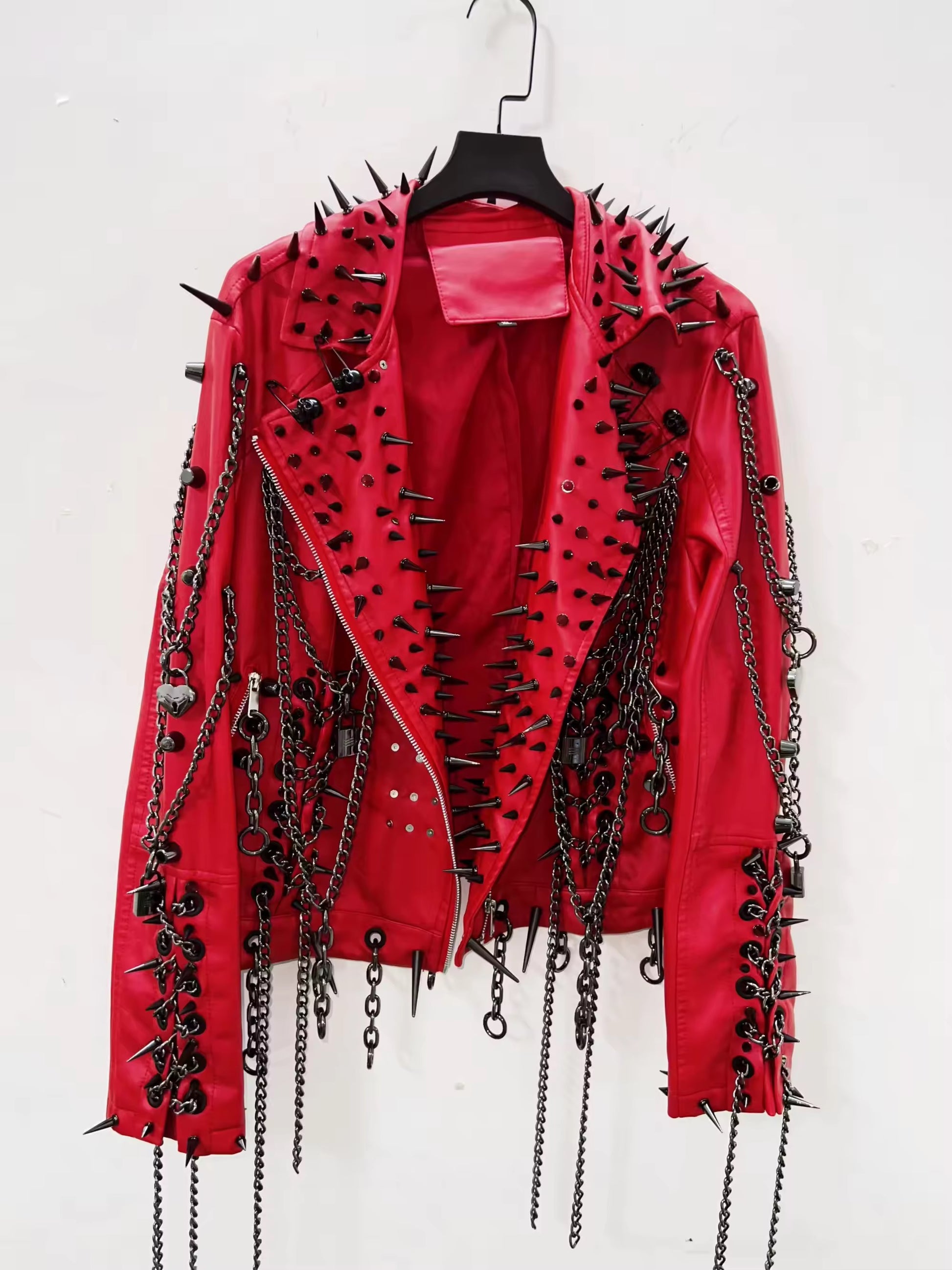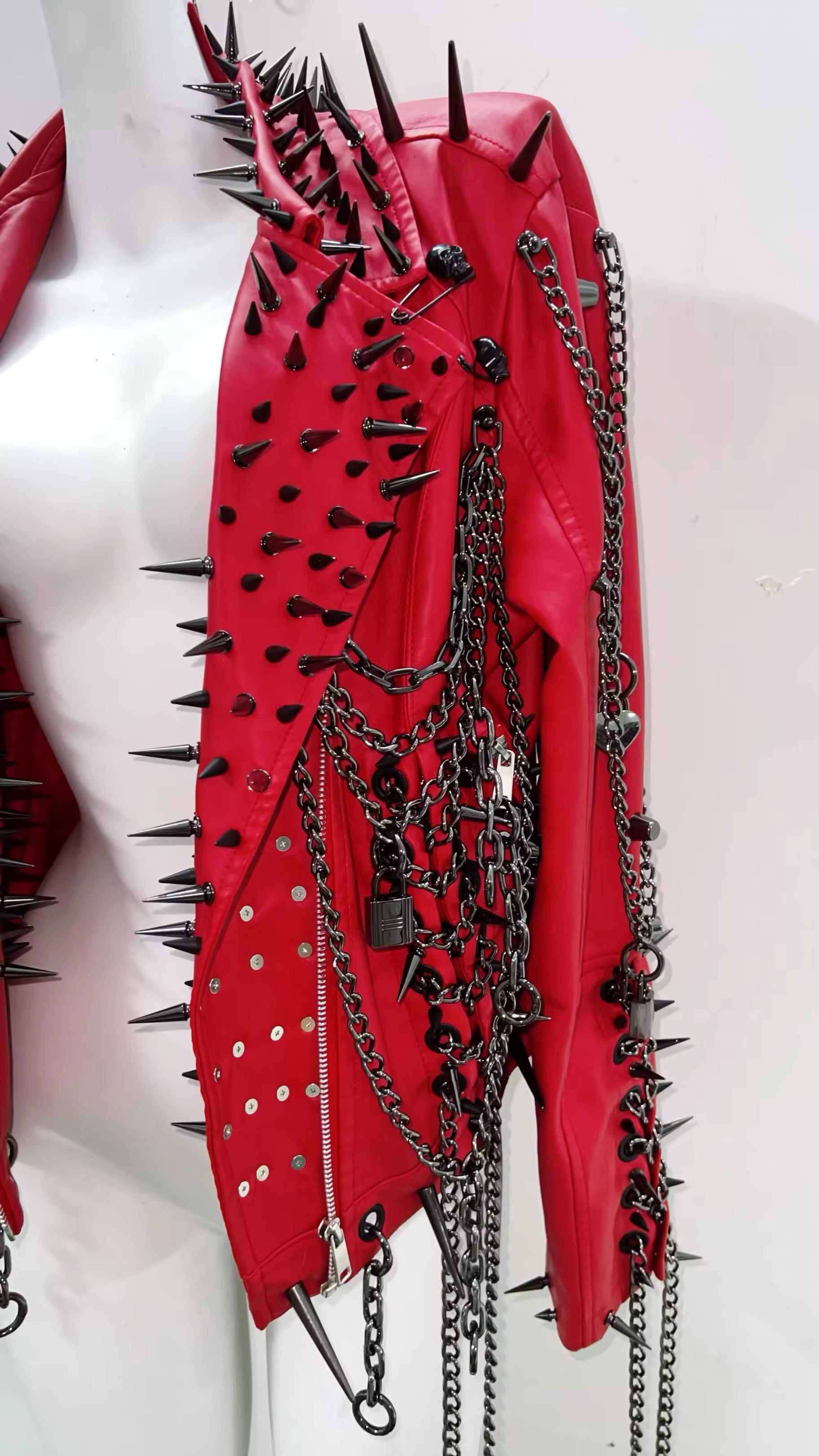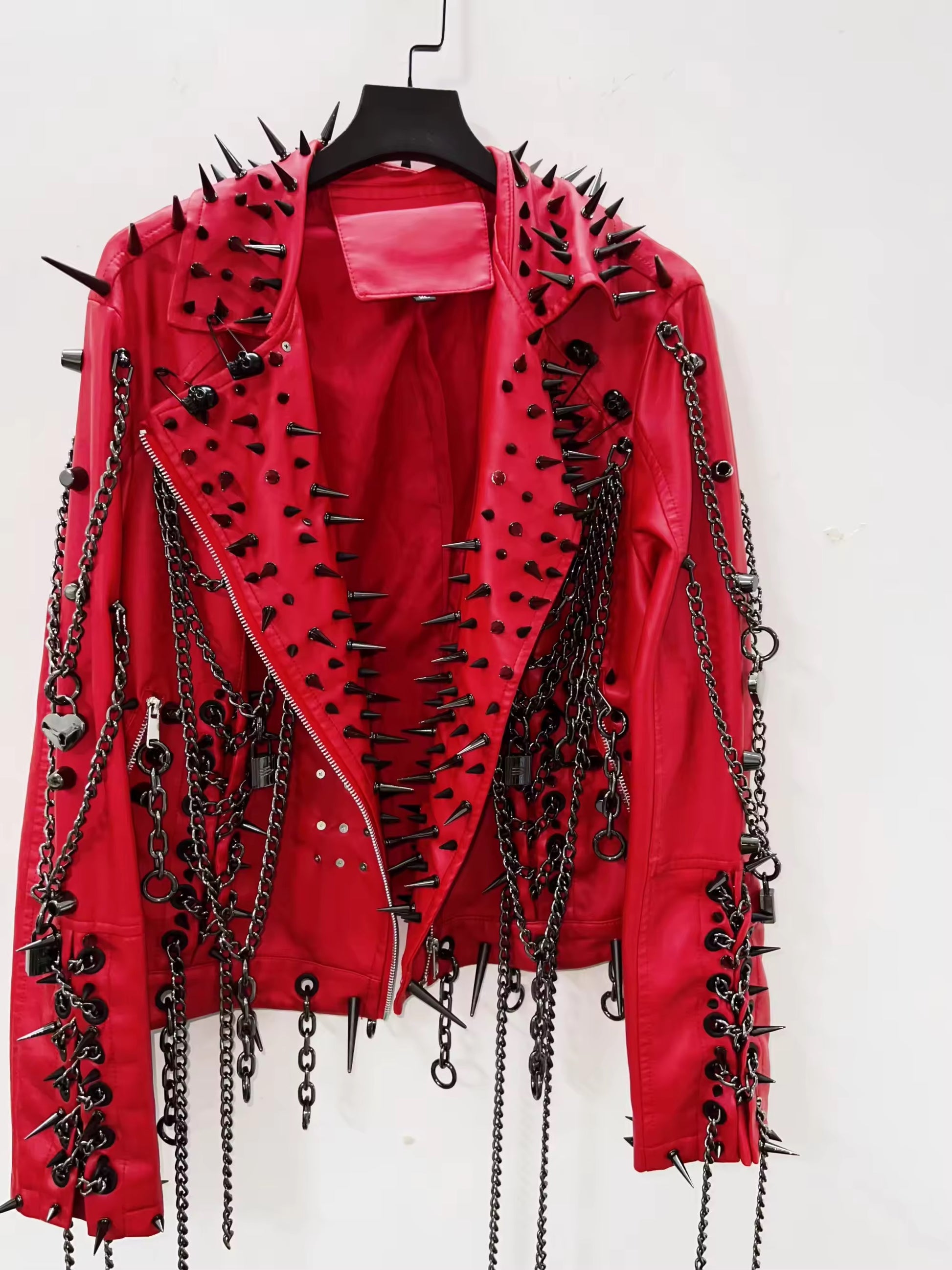 Expertly crafted from high-quality faux leather, this striking red jacket boasts edgy punk details, including black spike studs, chains, and padlock and heart charms. With a sleek zip fastening and a flattering fit, this jacket is perfect for making a bold fashion statement. Be sure to refer to our size guide in the images to find your perfect fit. Embrace your inner rebel with this must-have piece.