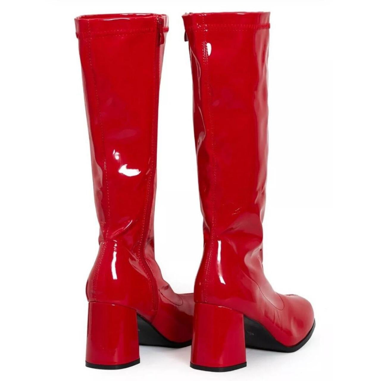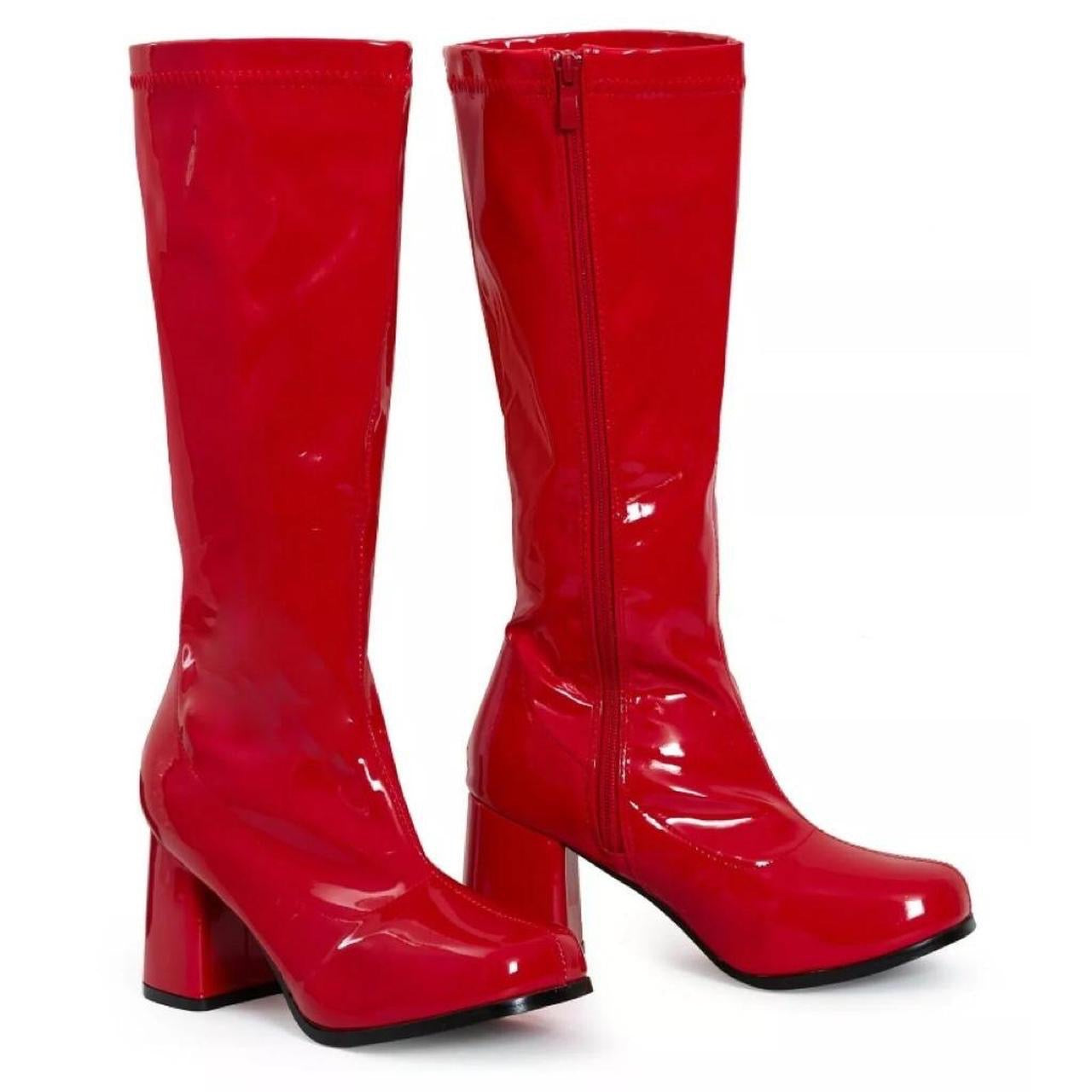 These Red Patent Faux Leather Go Go Knee High Boots are sure to make your inner 60's rock star go crazy! With a bold, attention-grabbing patent shine, these boots will ensure you look "oh so groovy" wherever you go! Get ready to dance the night away. Boot-scootin' boogie!
