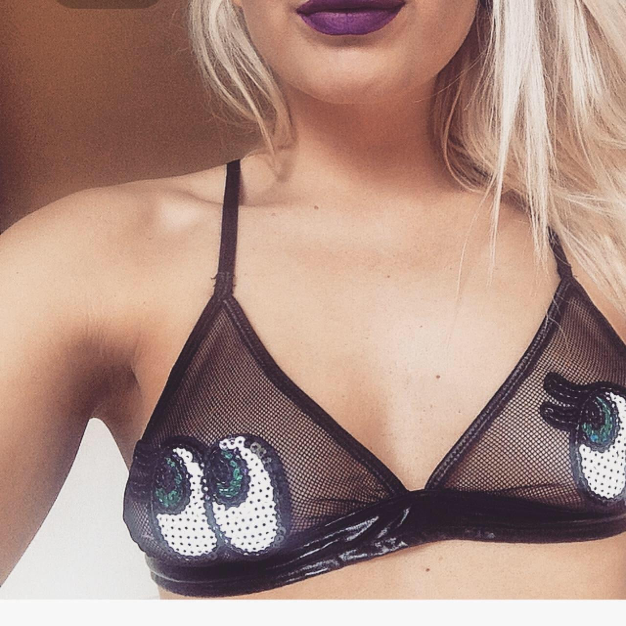 Sequin Eyes Patch Mesh Faux Leather Bra