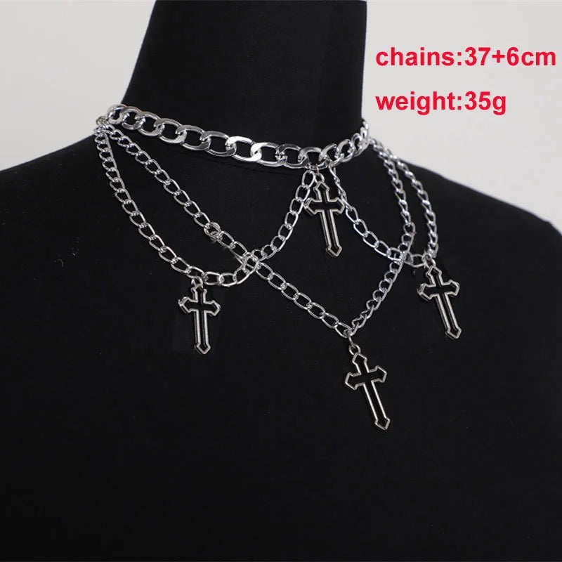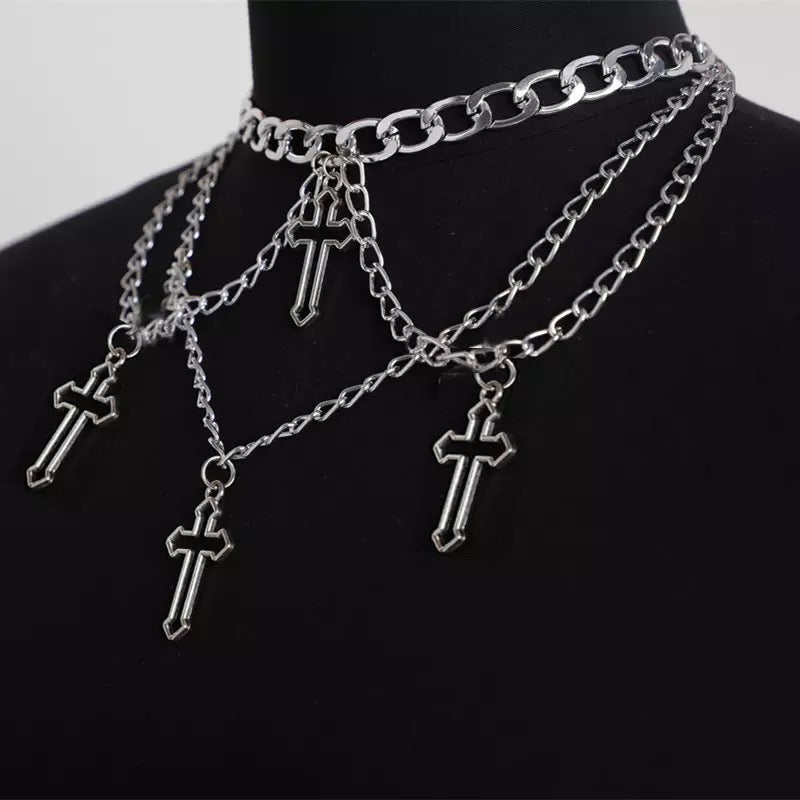 Silver Gothic Cross Pendant Layered Choker Necklace