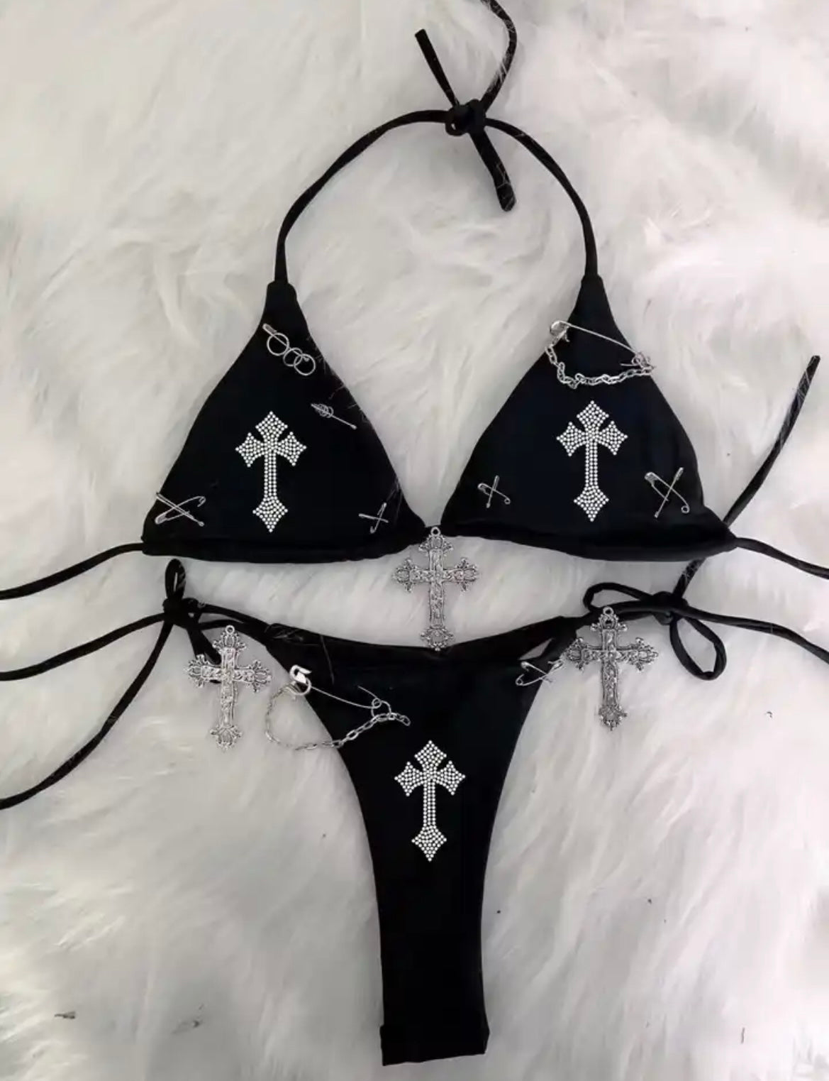 Show off your edgy style with this two-piece bikini set. It features stylish rhinestones and a bold cross design to make a statement. Paired with gothic charms, you'll be sure to stand out at the beach or pool.