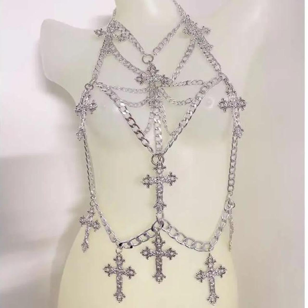 This unique silver chain Gothic Cross Punk Body Harness is the perfect accessory for those who want to make an extra statement in their outfit. The sturdy construction and gothic charms make it perfect for layering with other pieces.