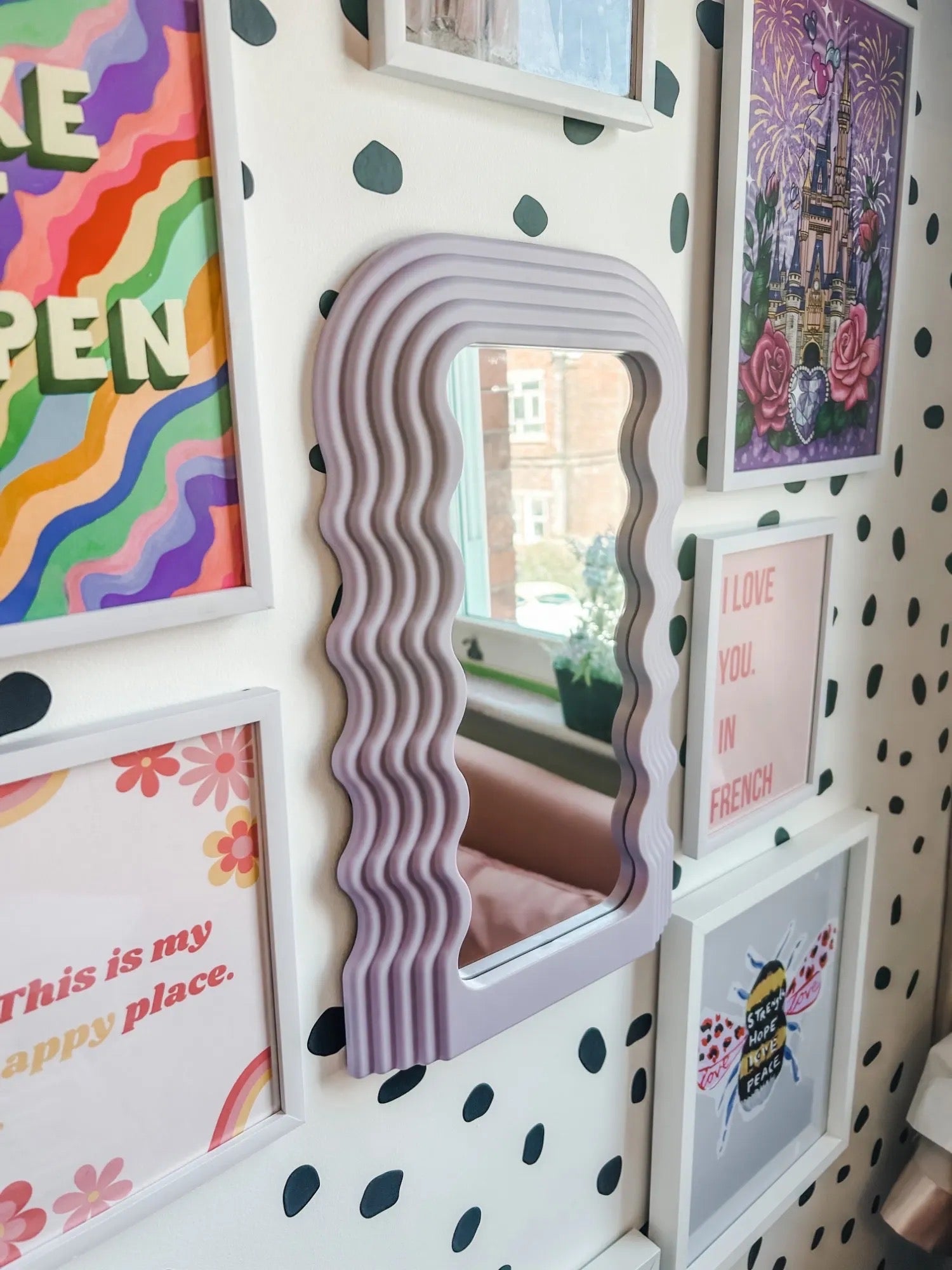 The Wave Novelty Art Gallery Mirror is your perfect choice for decorating your home. Each mirror comes in five unique colors to brighten up any space. Whether you want to create a fun gallery wall or use as a vanity mirror, this TikTok-famous wavy mirror is the perfect addition to any room.