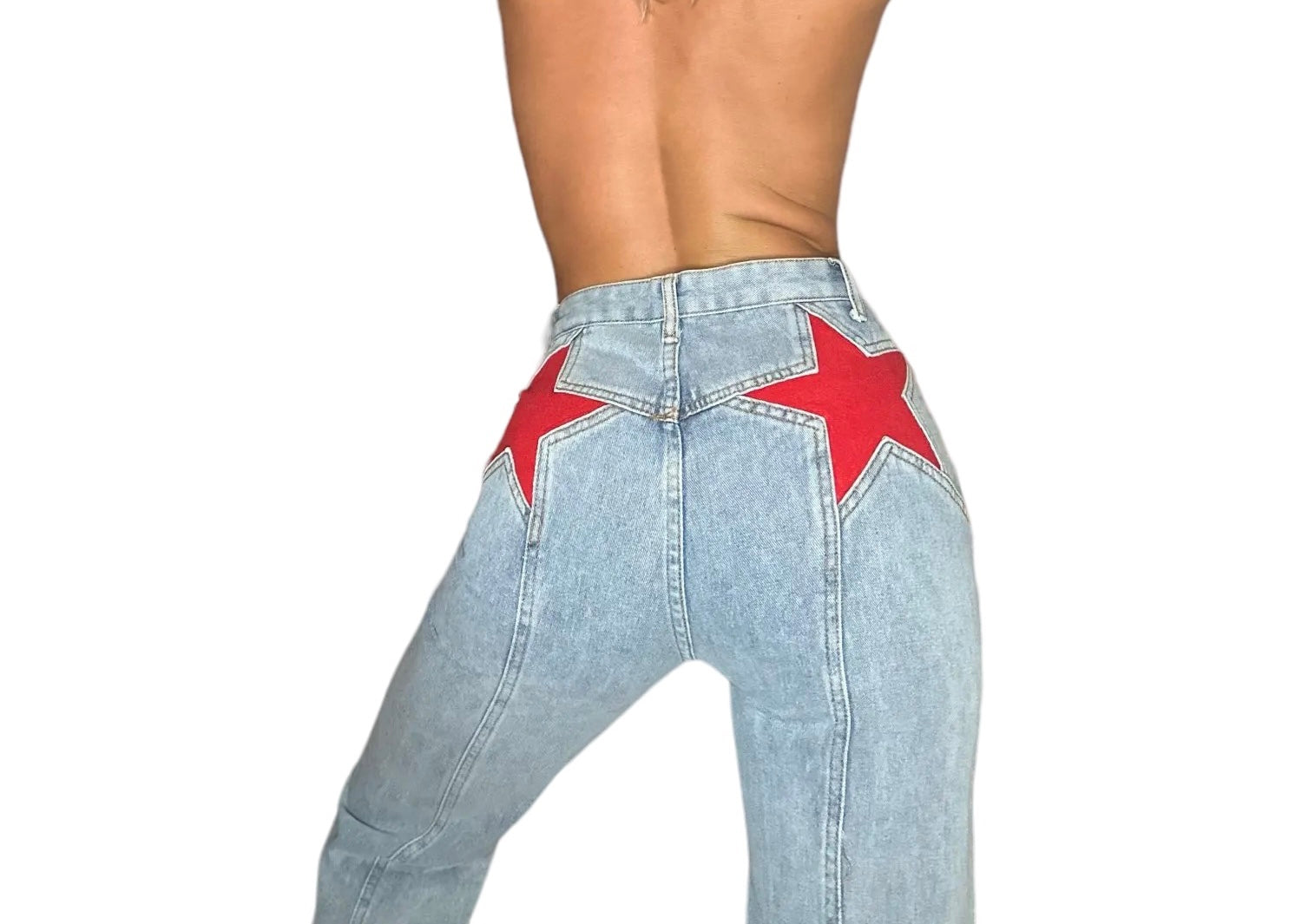 These blue, high waisted Y2K Star Jeans make a perfect addition to any wardrobe. Made with quality materials, they are designed to be comfortable and durable. The star patches on the back provide an eye-catching detail for a basic everyday jean.