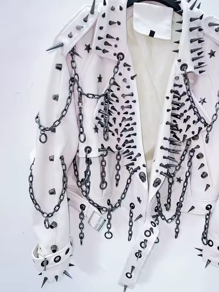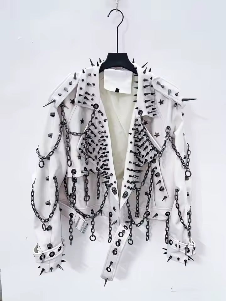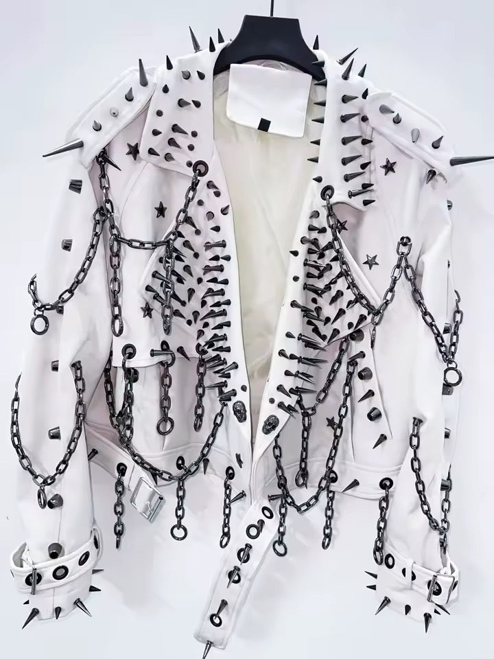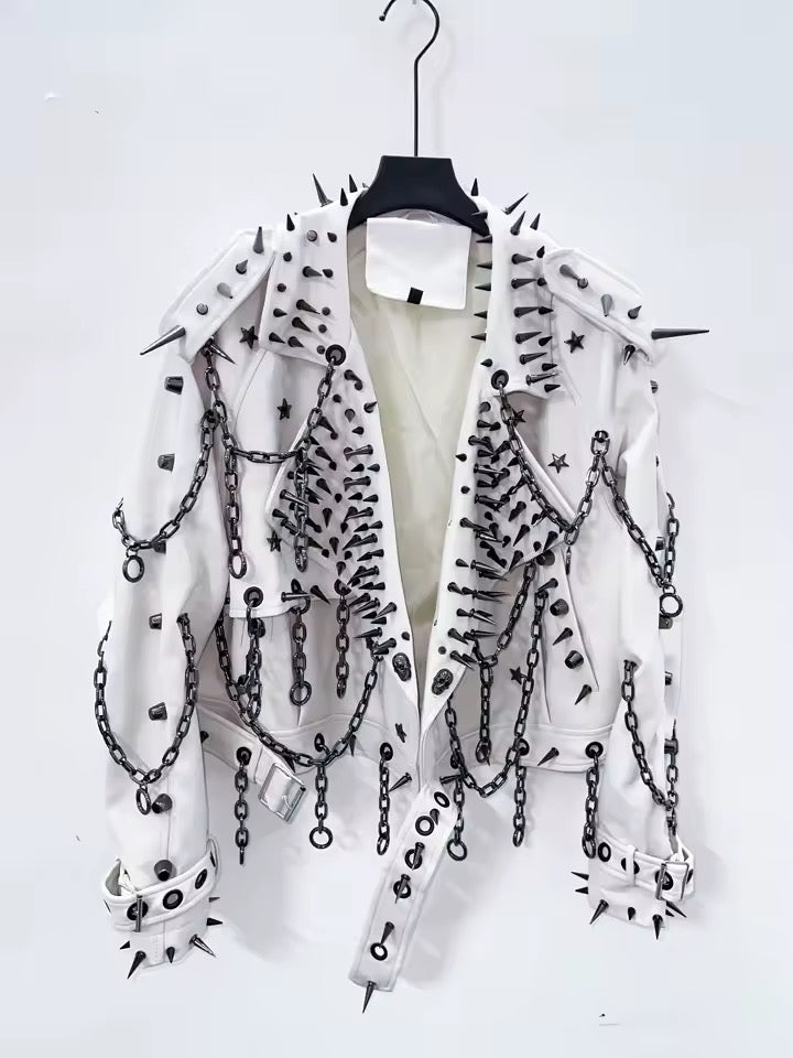 This monochrome faux leather jacket is a unique addition to your winter wardrobe. With its contrasting black spike studs and chains, it adds a punk edge to any outfit. Made of high-quality faux leather, it's suitable for both men and women. Stay warm and stylish with this must-have item.