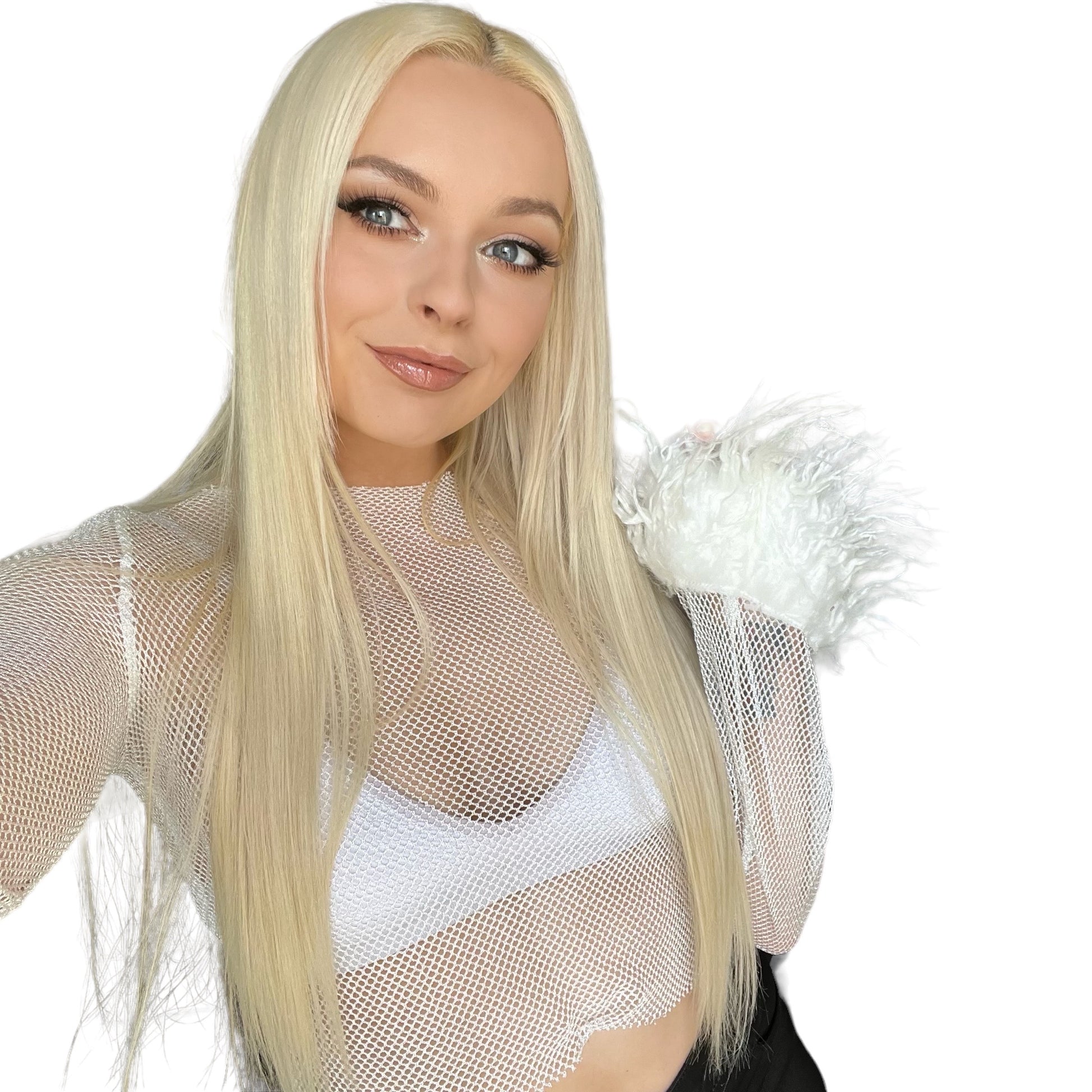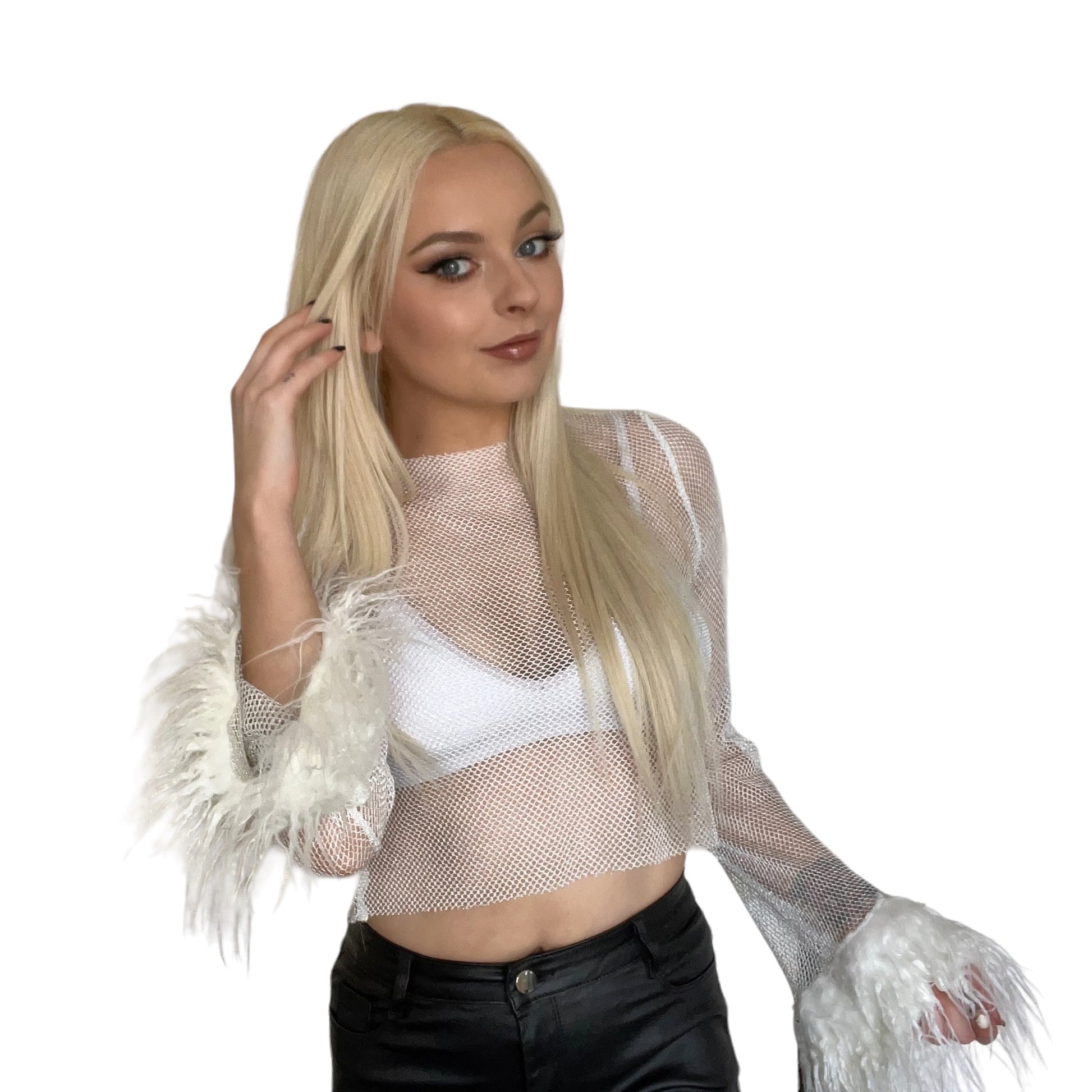 This White Fishnet Y2k Fluffy Crop Top is perfect for achieving that iconic Y2k look. Made from a soft netted fabric and featuring long sleeves with fluffy wrists, this crop top is both comfortable and stylish.