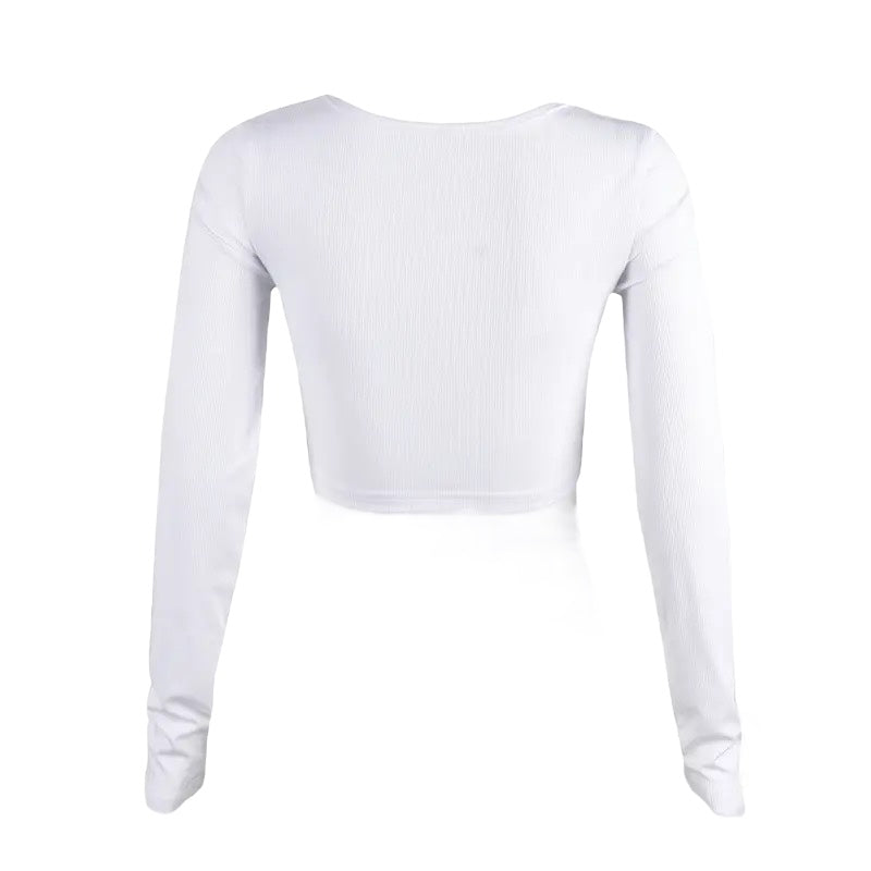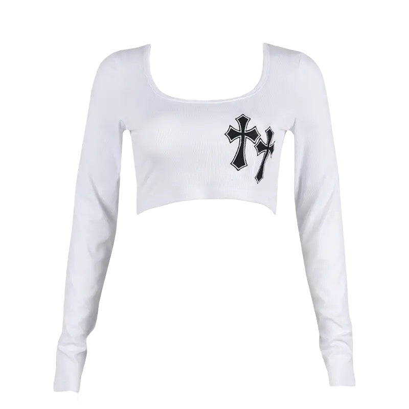 White Long Sleeve Cross Patch Gothic Crop Top