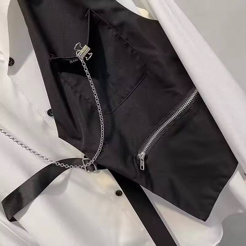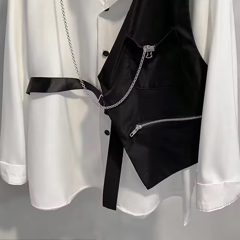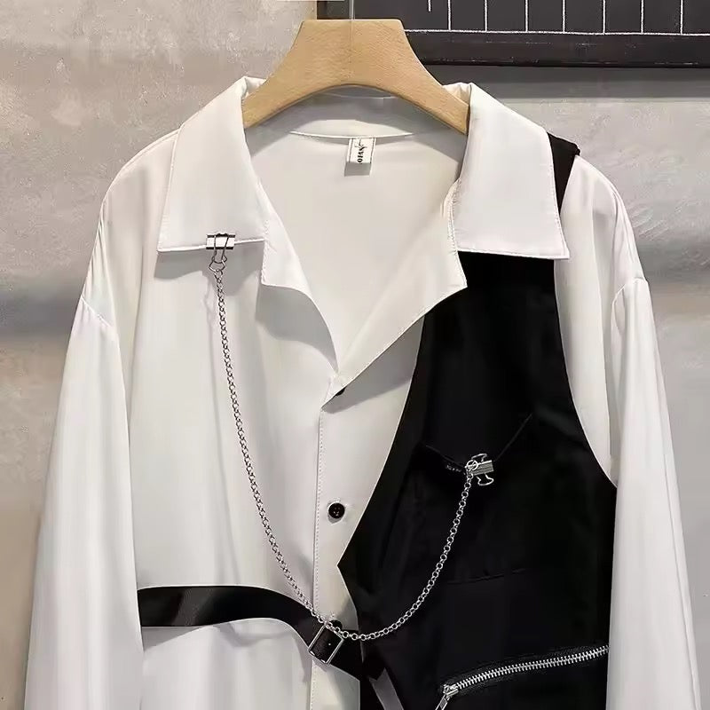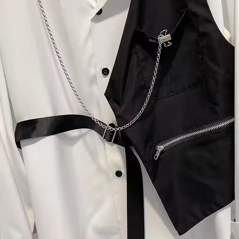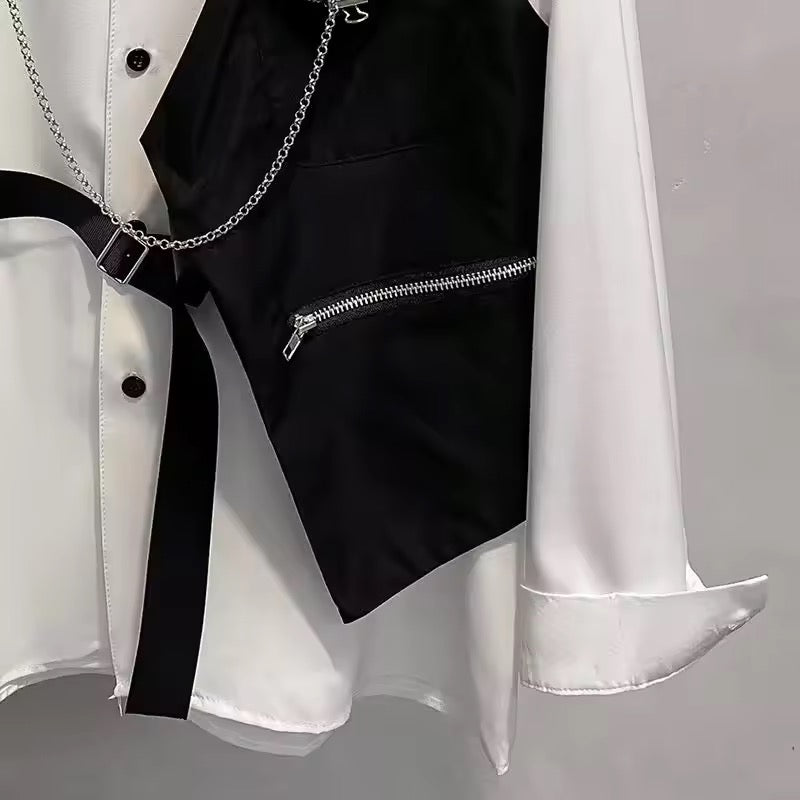 Expertly designed for a chic and edgy look, our White Oversized Half Vest Punk Chain Blouse is a must-have for any fashion-forward individual. The crisp white blouse boasts a bold black half vest attached and is adorned with striking silver chain detailing. With an oversized fit and button fastening, this blouse exudes both style and comfort.