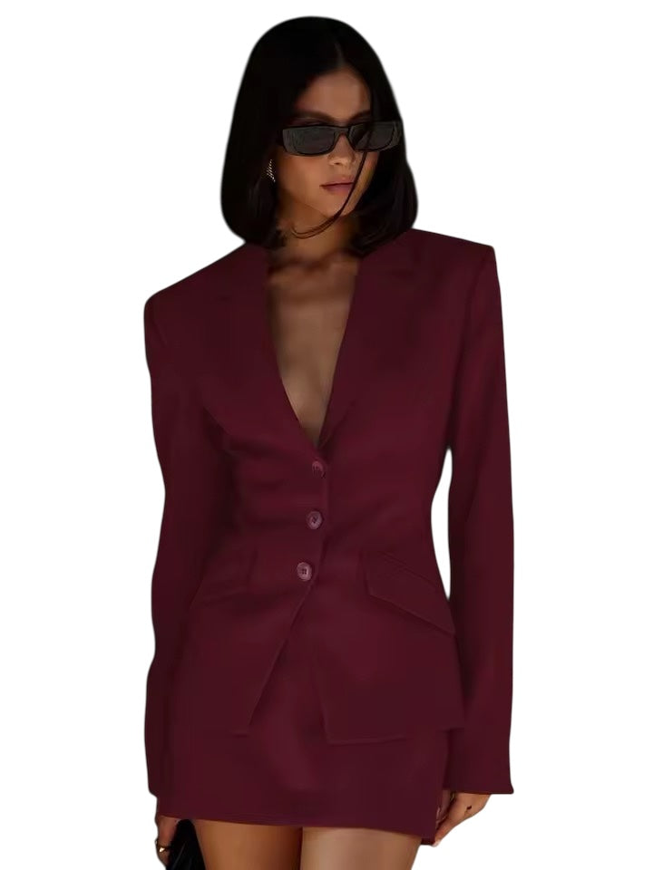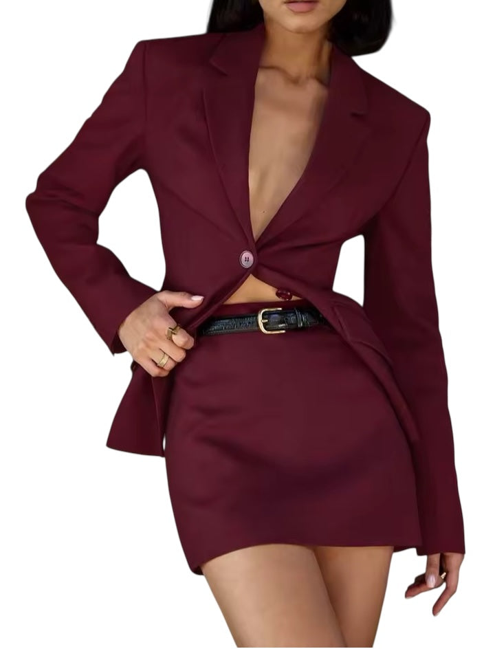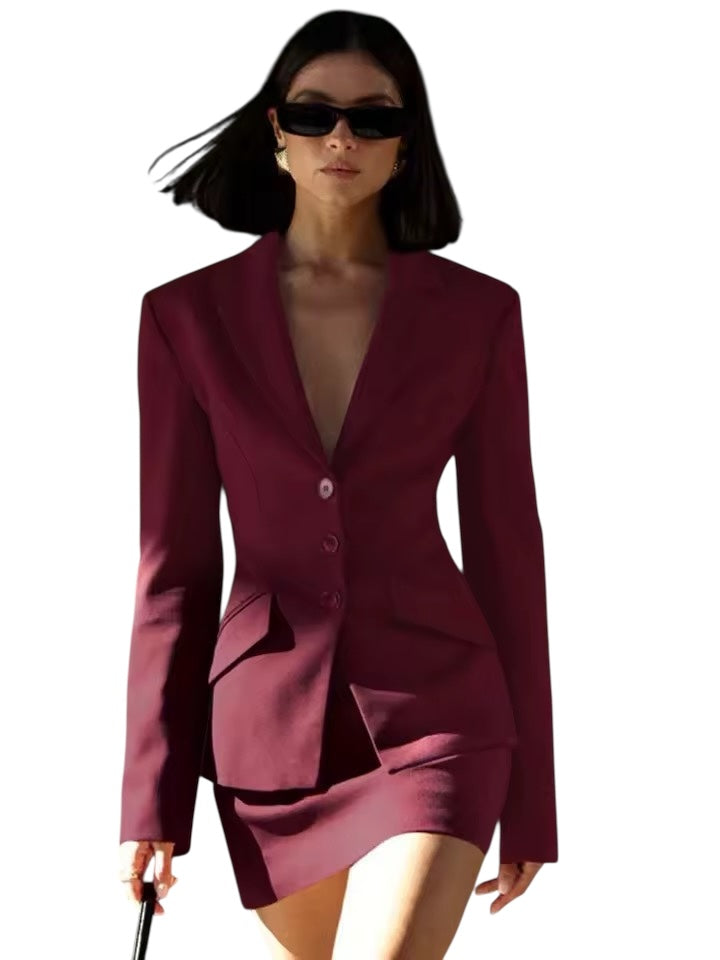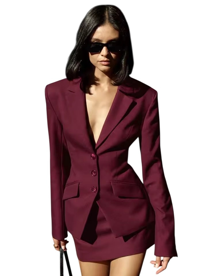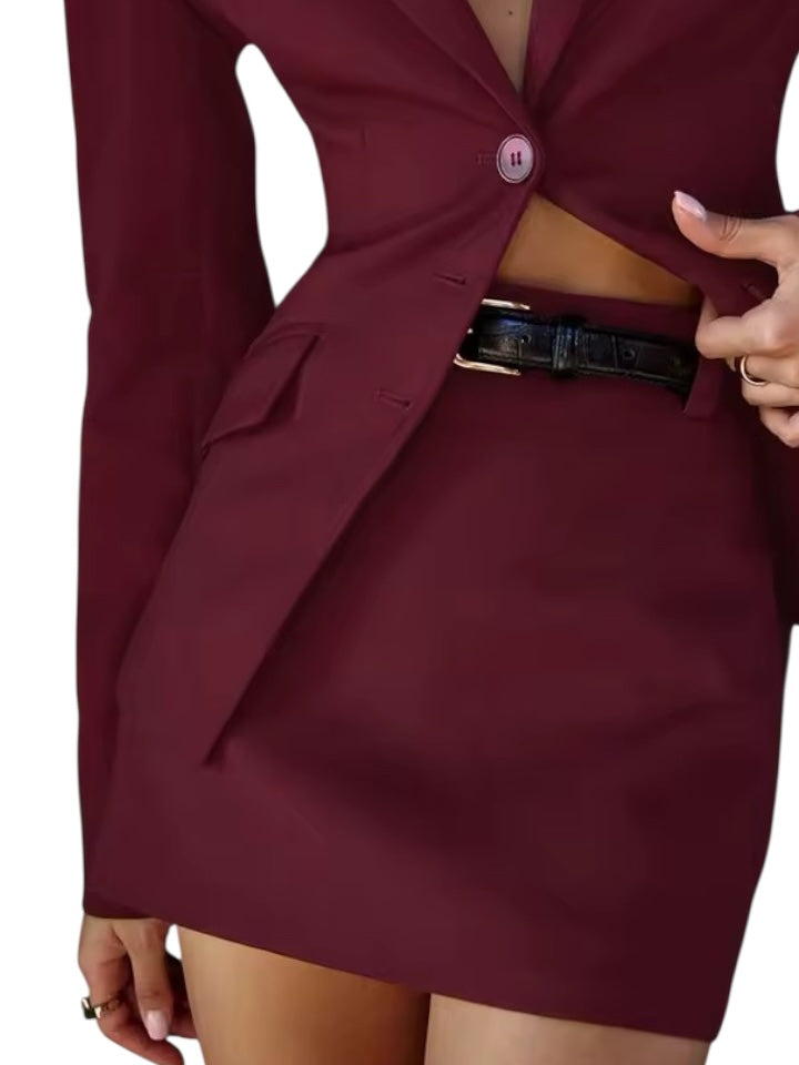 Upgrade your work wardrobe with our Wine Red CEO 2 Piece Skirt Suit Set. This versatile set includes a V-front blazer and a mini skirt that can be mixed and matched for a variety of professional looks. The bold wine red color adds a touch of elegance to your office attire. Perfect for creating a capsule wardrobe with endless options.