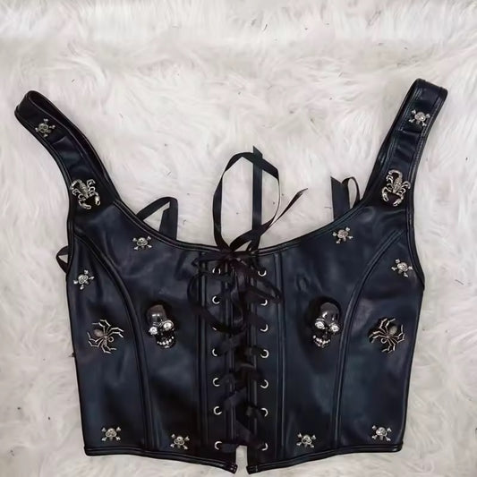 Black Faux Leather Gothic Punk Skull Corset Crop Top