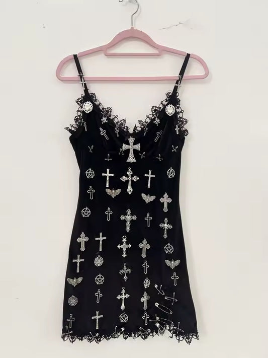 Black Gothic Punk Cross Charm Mini Lace Dress